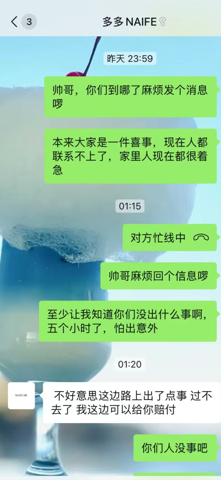 根据不同受害者发帖,“多多”在10月2日晚上还和多名客户有联系。在2日午夜过后,其还给不少人回消息称,“路上出了点事,过不去了我这边可以给你赔付”。